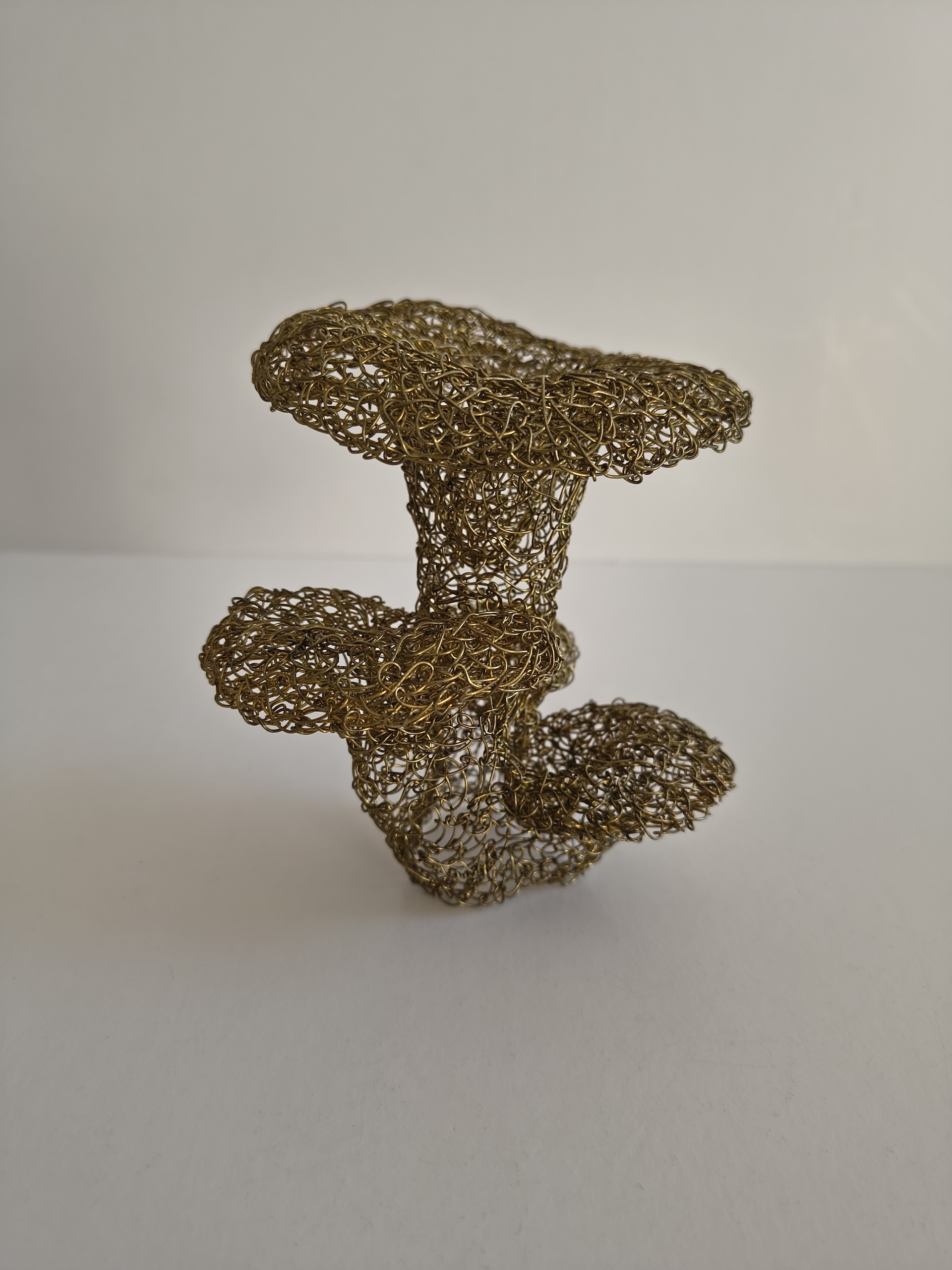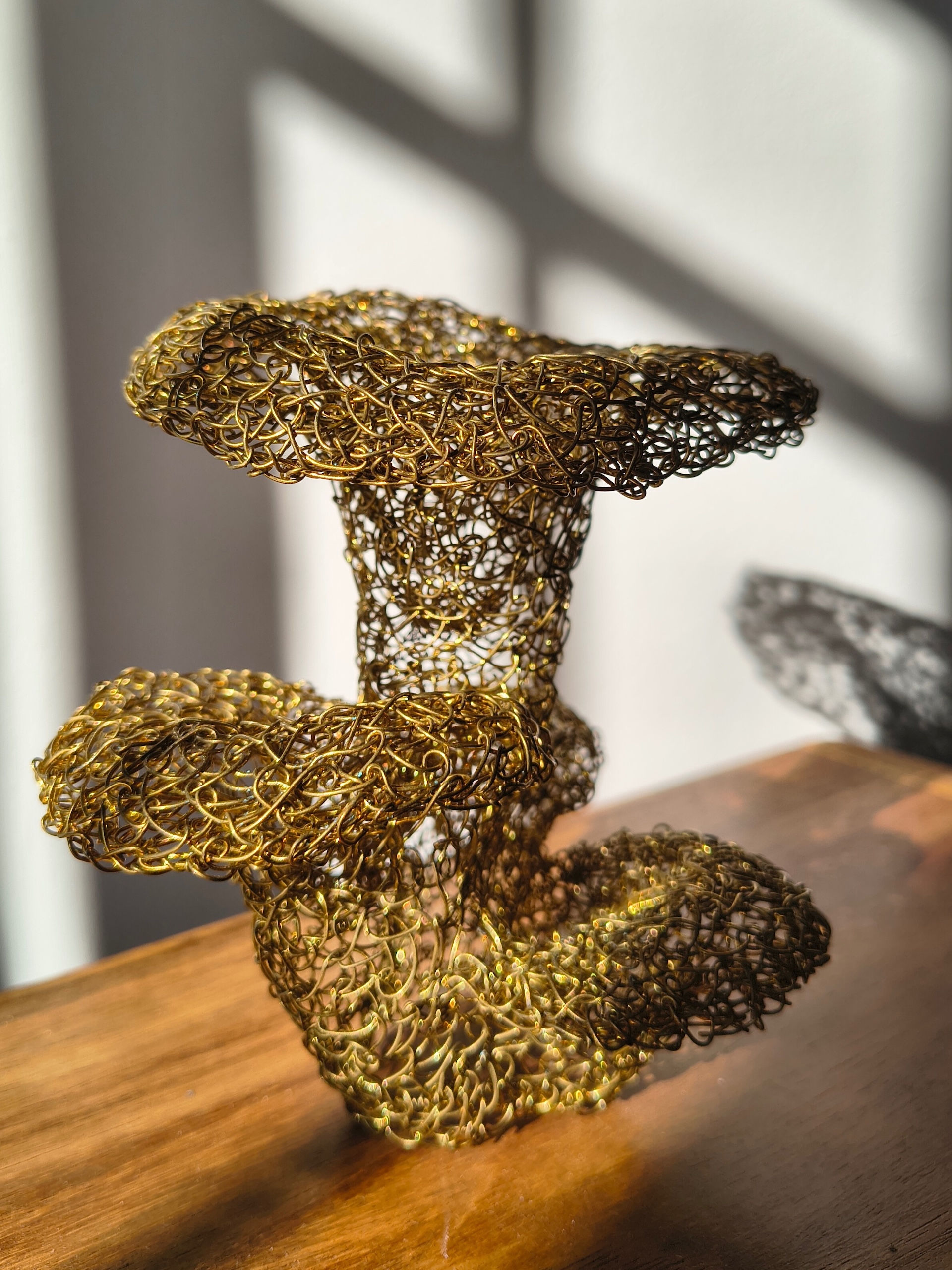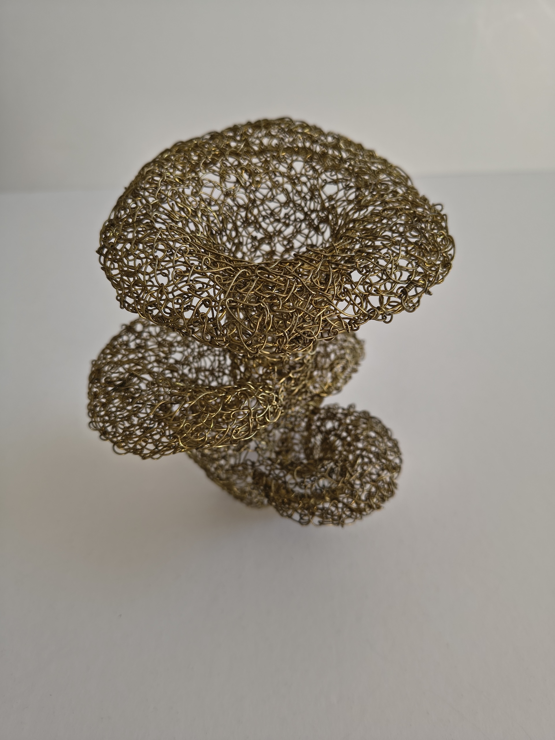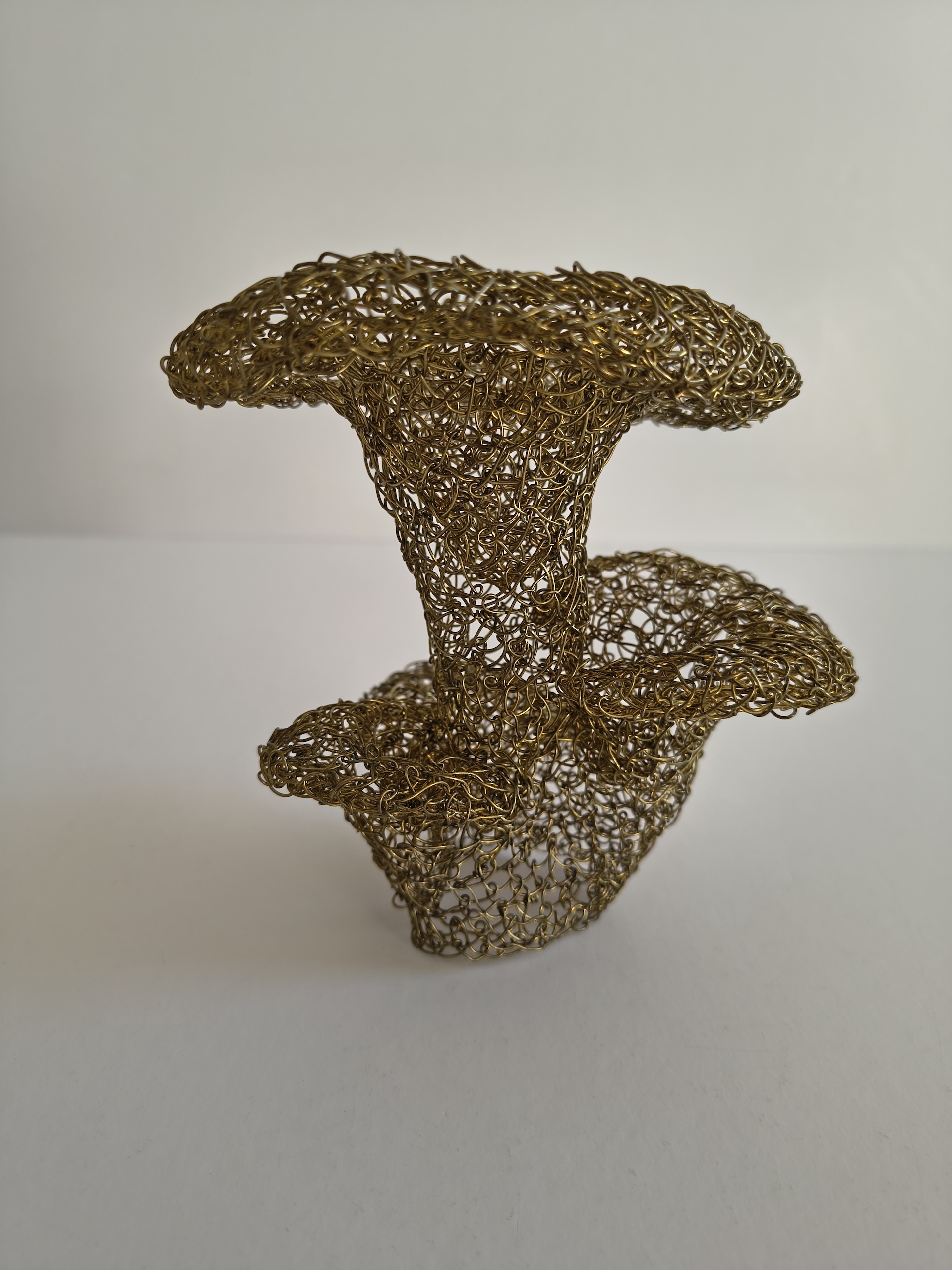 This self-standing oyster mushrooms sculpture is crafted from meticulously stitched metal wires, creating delicate caps and flowing stems. Its radiant, organic golden contours catch the elegance of nature in a striking, one-of-a-kind art piece.