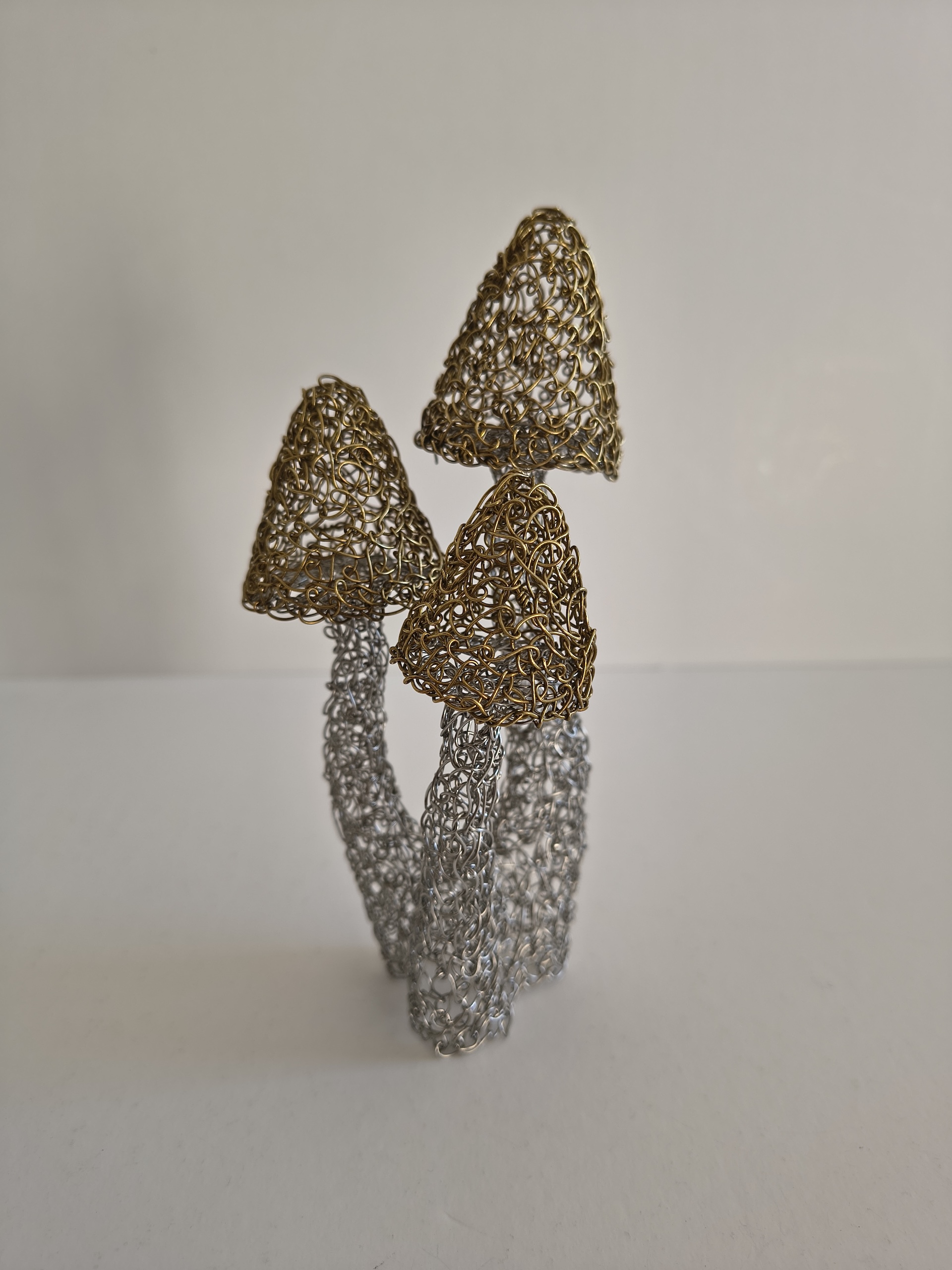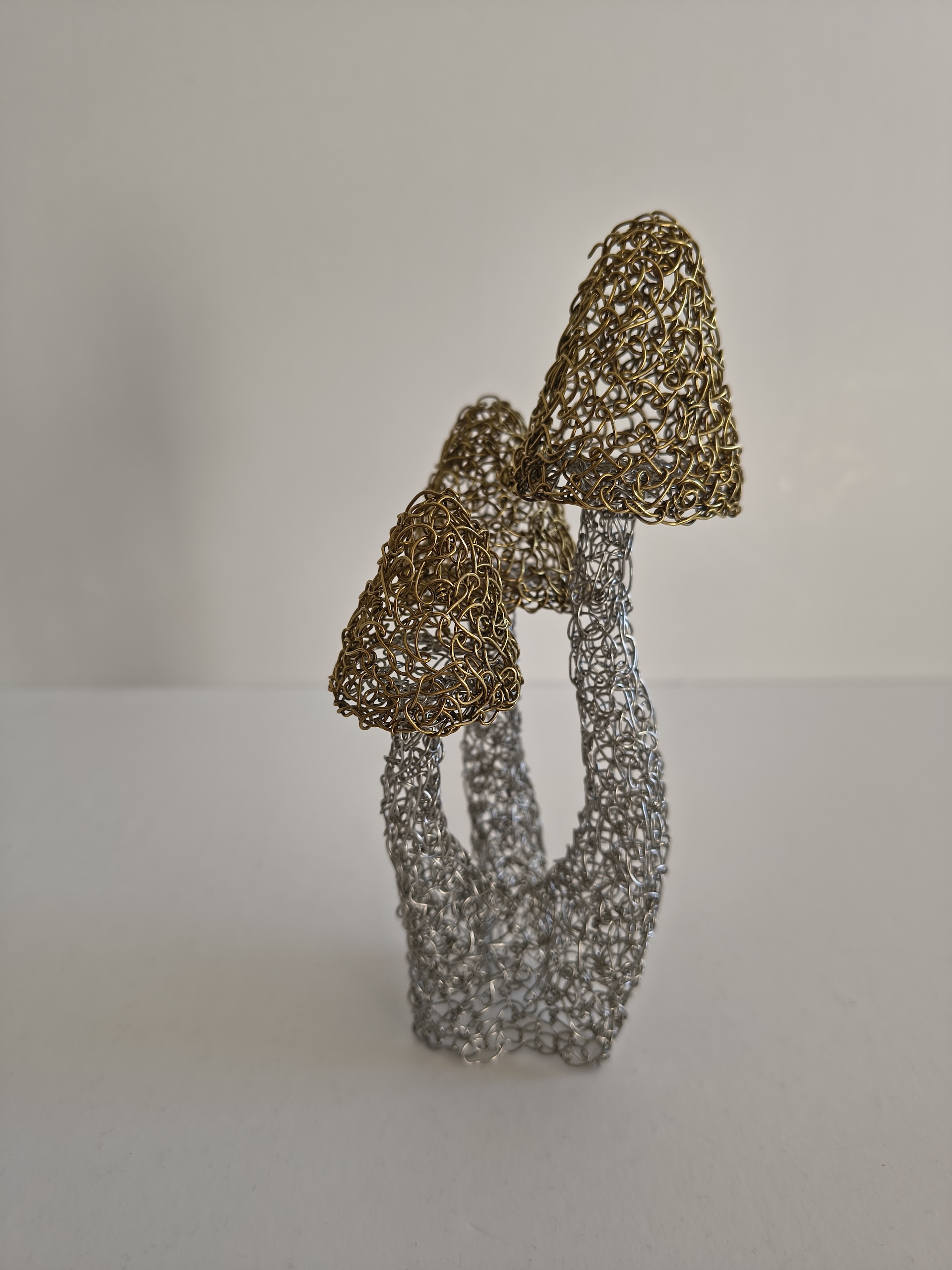 A cluster of honey mushrooms brought to life through stitched metal wires, this self-standing sculpture blends organic forms with contemporary craftsmanship. Each woven stem and cap showcases delicate detail, creating a luminous, one-of-a-kind artwork inspired by nature.