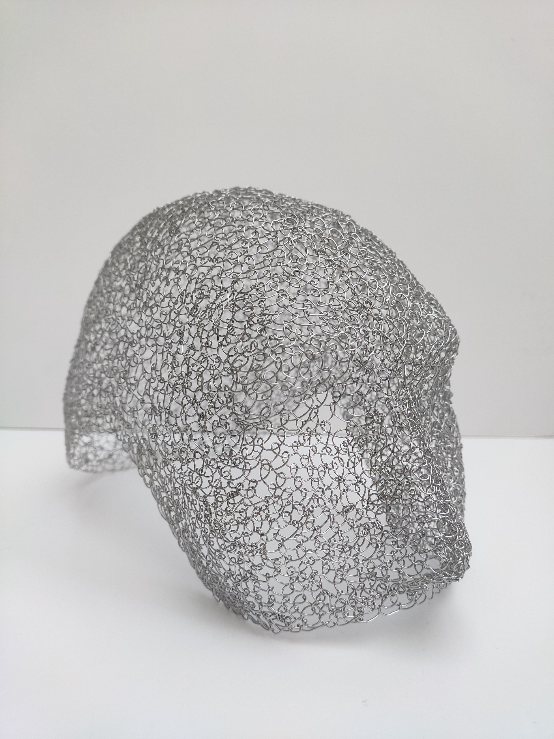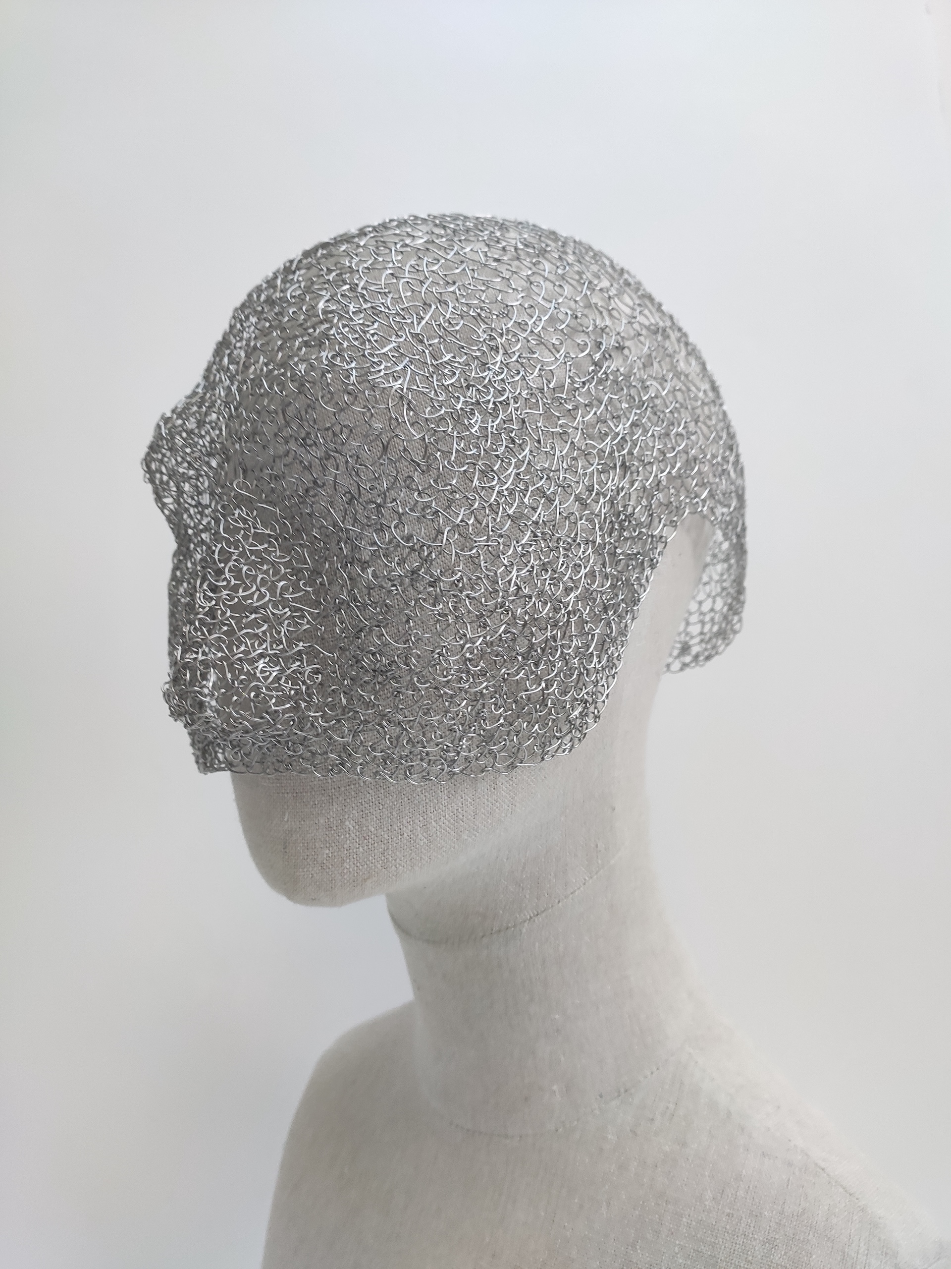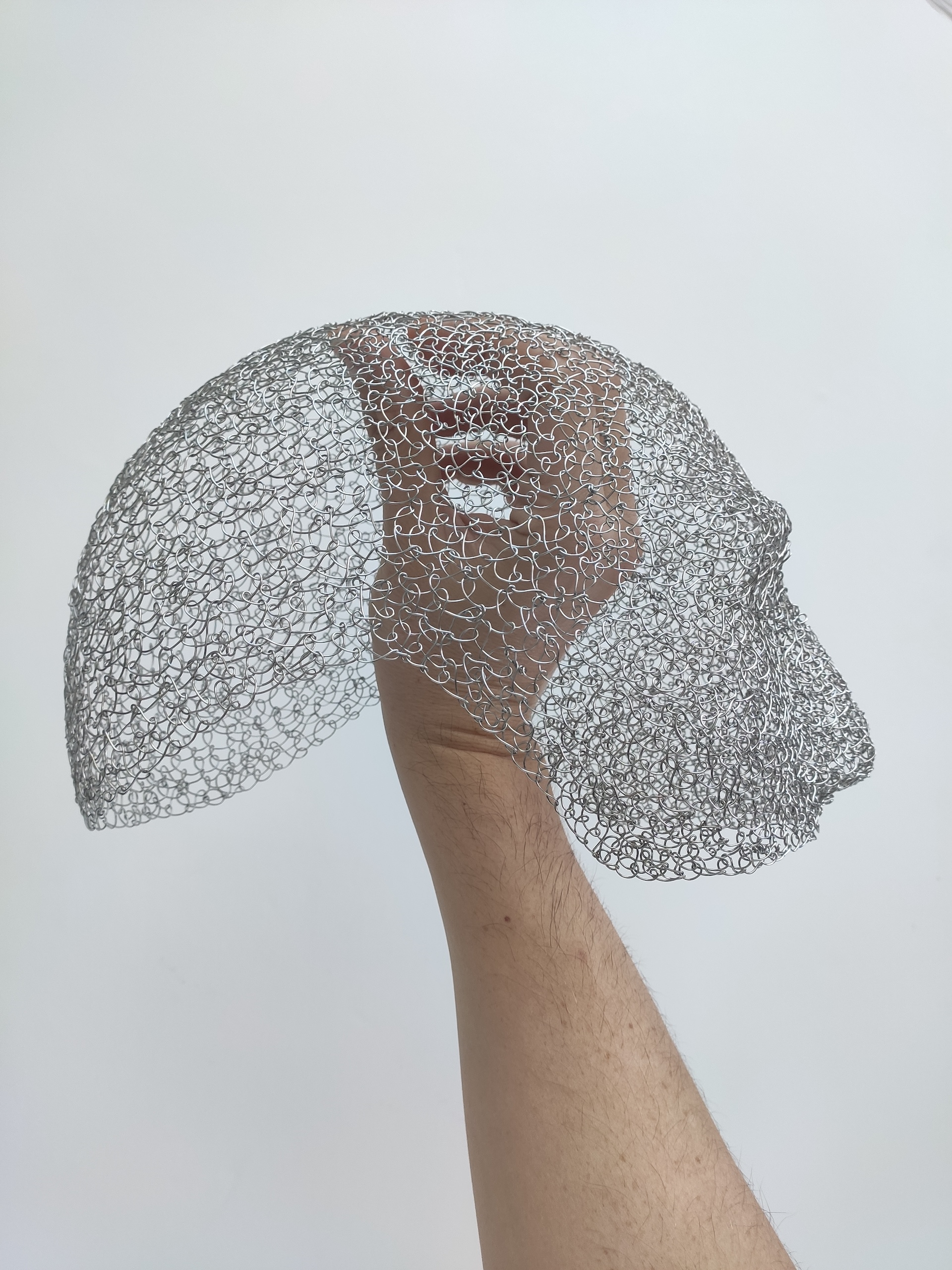 A unique half-face wearable mask crafted from handsewed stitched metal wires, inspired by iconic hero masks. Delicate yet bold, this sculptural piece contours the face with elegant metallic lines, turning wearable art into a striking statement of strength and style.