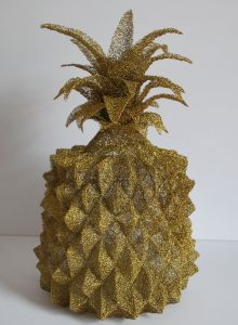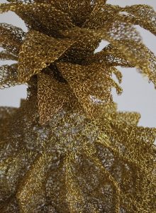 This unique handwoven sculpture intricately crafted from brass wire is a celebration of the complexity found within the seemingly simple pineapple. Artist captures the essence of this tropical fruit, weaving together the fine details and textures that make each pineapple a work of nature’s art. The use of brass wire adds a touch of elegance and sophistication to the sculpture, turning a humble fruit into a stunning piece of hand-crafted beauty.